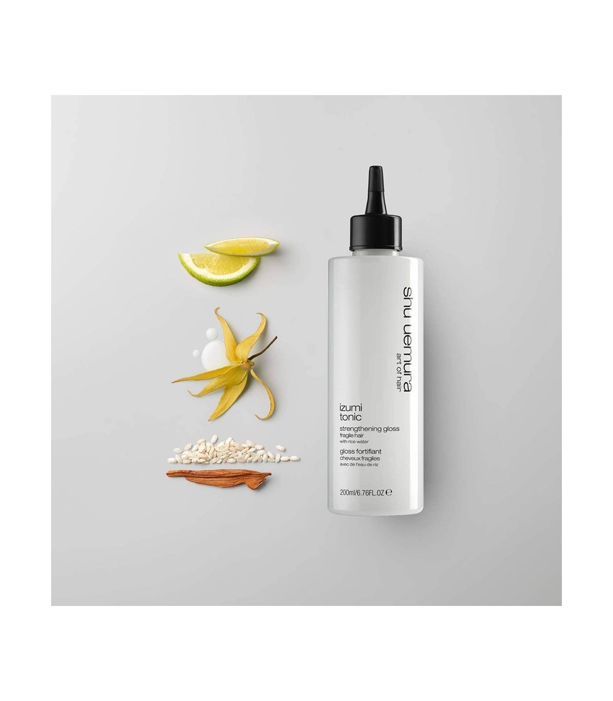 Izumi Tonic Strengthening Gloss — лёгкий лустирующий уход с эффектом «стеклянного» блеска, созданный для хрупких, ослабленных волос. Средство вдохновлено японским ритуалом yu-su-ru — традицией ополаскивания волос рисовой водой, и помогает быстро преобразить длину: сделать её более гладкой, дисциплинированной и сияющей.